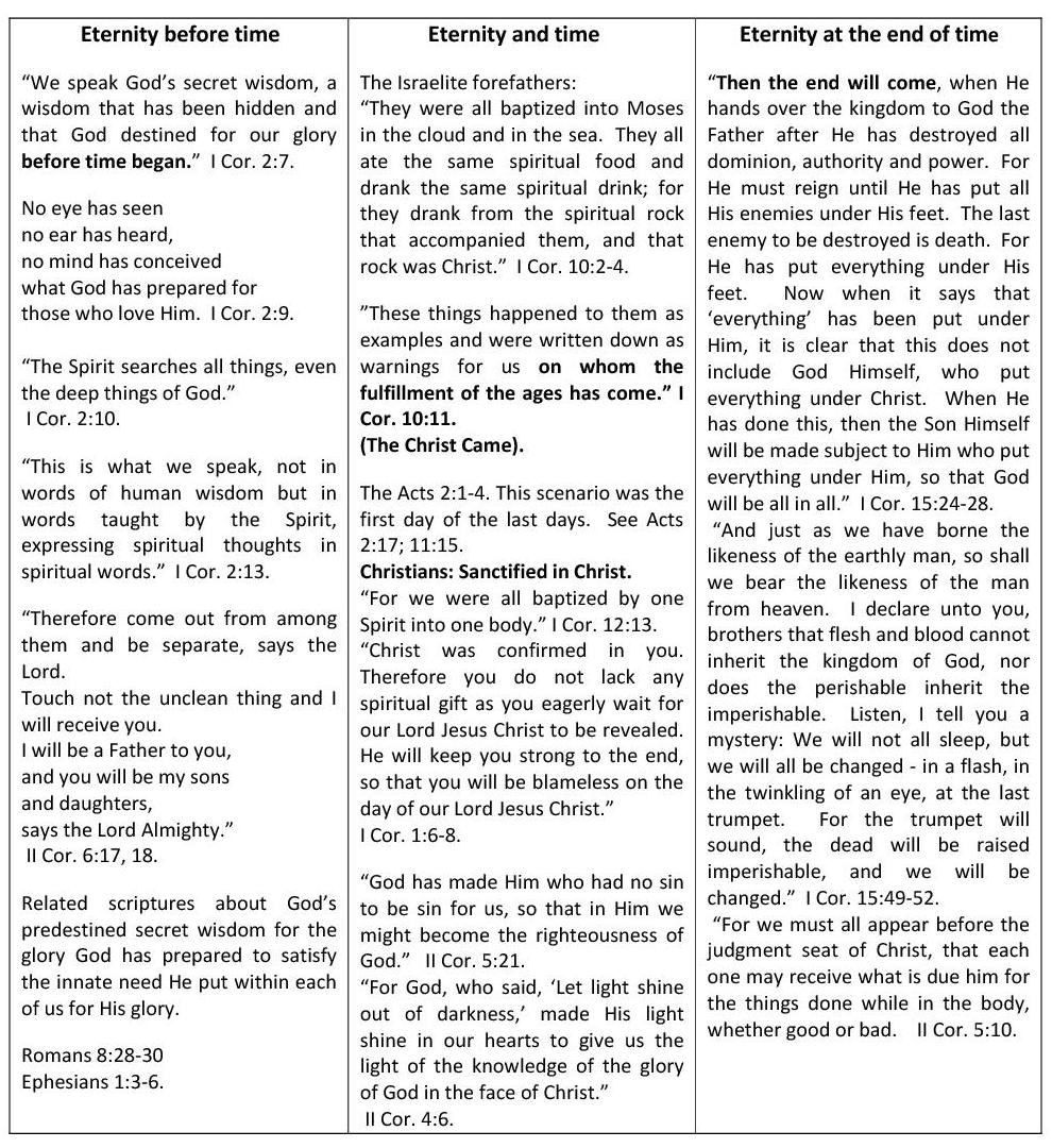 It will be necessary for us to view “time and eternity” with the same “world view” Paul taught the Corinthians during the one and a half years period he co-built this church with Jesus. Please note how the first column delved into the “secret mind of God” before time began. God “destined for our glory;” that is, He preplanned to satisfy our innate need for glory that He has embedded in every human being. We can be His “sons and daughters” now and inherit life in His eternal kingdom as His children. We need to understand this first column when we study every book in the Bible. Mature spiritual Christians have faith in God’s program for mankind and this is one reason we love God. Please note God’s plan is for mature Christians who love Him (I Cor. 2:6, 9). If we do not understand all three columns in this chart we will have trouble understanding Paul’s letters.