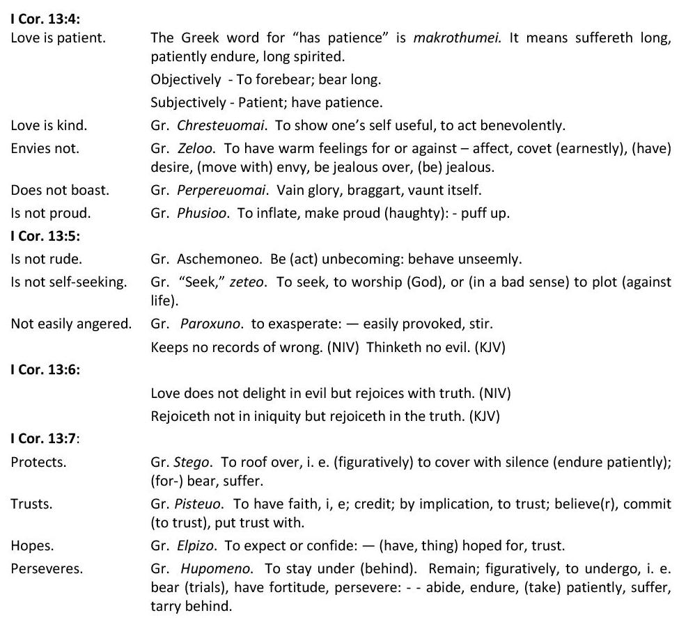 One way these weaknesses in the church were manifested was in their “boasting.” This had resulted in division in the church (I Cor. 1:10). The division of the church of God is what the Corinthian letters are dedicated to solving. Please review Part II, Lesson Two. Since love does not “boast,” Paul introduced the topic of love as a solution for division (I Cor. 13:4).