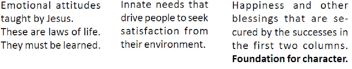 But why is it that we have so many unhappy homes? The answer is found in the first column. We must maintain these attitudes while seeking satisfaction of our innate needs in column two. We will also need the blessings in column three to be successful for they are the foundation for our strong character. The key thought is integration of all three columns.